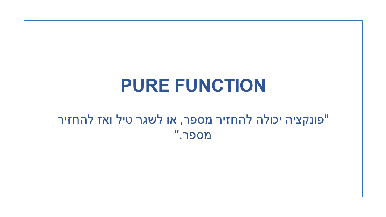 מי שחובב תכנות פונקציונאלי (Functional Programming), מכיר את המושג pure function, שמשמעותו פונקציה המספקת את התנאים הבאים: א) תמיד להחזיר את אותו הפלט ביחס לקלטת שהיא מקבלת, ו- ב) לא להכיל שום side effect בתוך הפונקציה עצמה, כמו: שינוי משתנה מחוץ לסקופ שלה, Input/Output, או כל דבר אחר שלא קשור לפלט של הפונקציה.