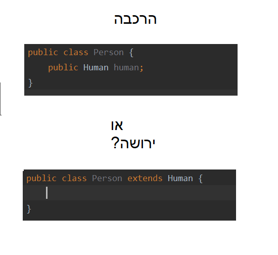 מאז השרשתי את המושג הרכבה מעל ירושה- במקום ליצור קשר בין אובייקטים בעזרת ירושה, אפשר בעזרת הרכבה (לשתול רפרנס של “היחס” בתור אובייקט כפרופרטי במחלקה). זה מאפשר גמישות כשאתה רוצה לשנות את היחס, ופלוס קטן הוא שאפשר להחביא את הגישה לאובייקט, כלומר encapsulate, יתרון שאין לנו בירושה (לא תוכל להחביא את הגישה ל-human בירושה כשאתה משתמש באובייקט של person).